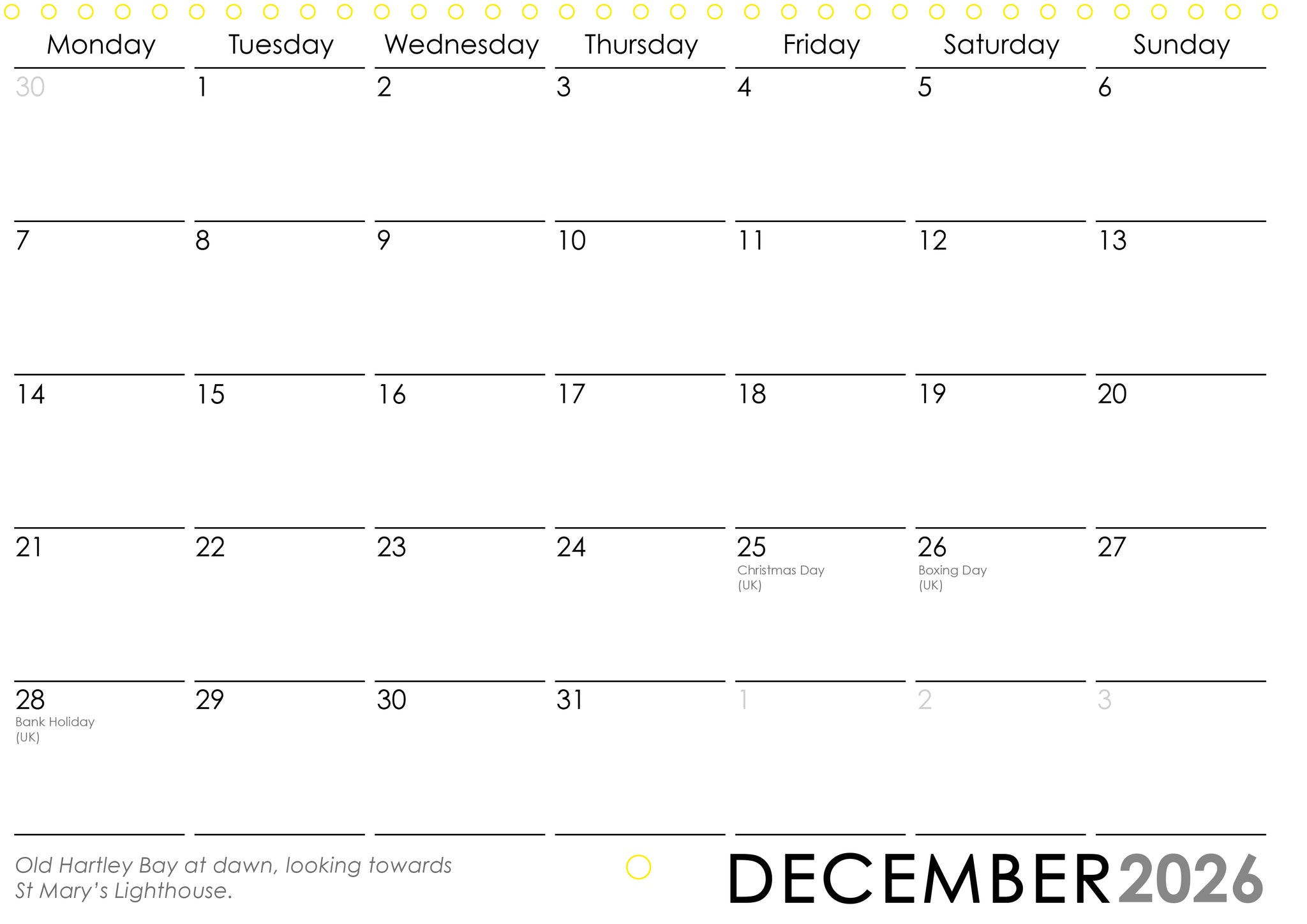 The calendar is professional printed, bound and wrapped in a cello bag making this an ideal present for anyone who knows and loves the North Tyneside Coast. It is also a practical calendar with plenty of space to mark important dates on the A4 calendar page for each month.
