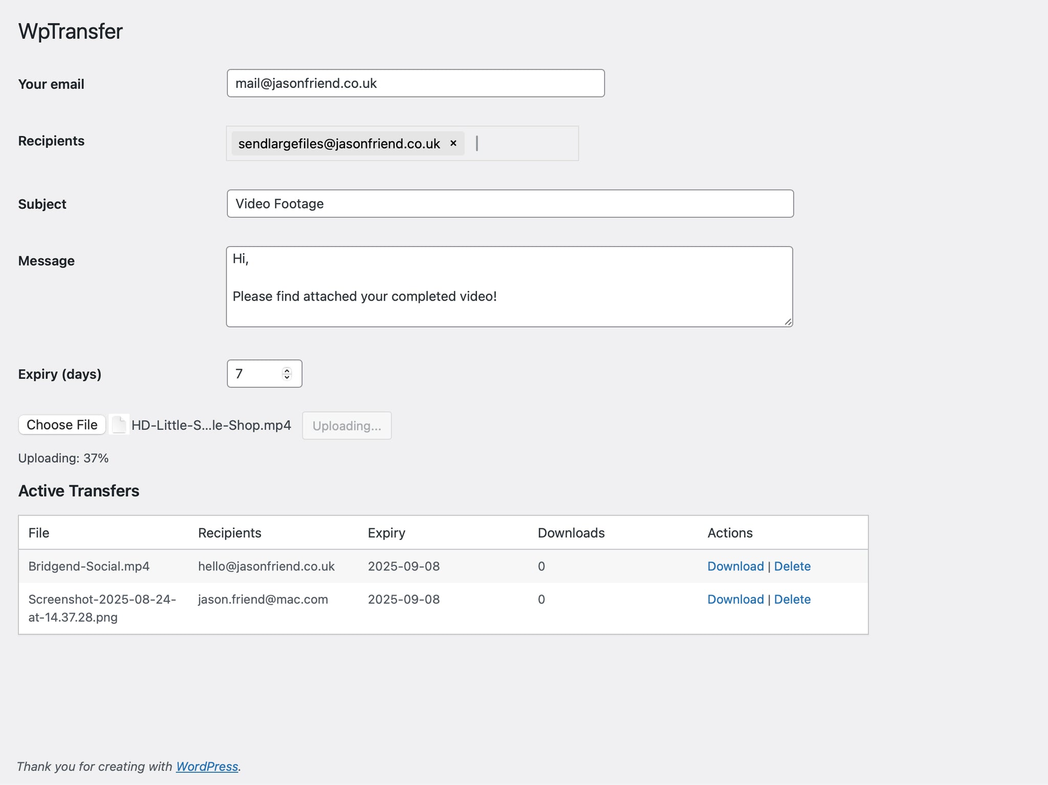 Share large files directly from your WordPress dashboard with WpTransfer, the lightweight, secure, and easy-to-use WordPress file sharing plugin. Perfect for photographers, designers, agencies, and businesses, WpTransfer makes sending big files fast and professional.